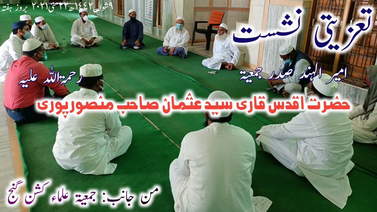 آج (٩شوال١٤٤٢ھ ٢٢مئی٢٠٢١ء بروز ہفتہ) جمعیۃ علماء کشن گنج کی دعوت پر علاقے کے مرکزی ادارے جامعہ حسینیہ مدنی نگر کشن گنج بہار میں صدر جمعیۃ حضرت امیر الہند رحمۃ اللہ علیہ کے لئے محدود افراد پر مشتمل تعزیتی نشست زیر صدارت حضرت مولانا غیاث الدین قاسمی صاحب منعقد کی گئی،جس میں علاقے کے چیدہ چنیدہ افراد نے شرکت کی، ذیل میں اس نشست کی مختصر رپورٹ پیش خدمت ہے :